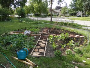 I’m out in the yard several days a week. In addition to the unexpected tan, one of the pleasant side effects of all this hard work has been meeting neighbors. People like to talk about gardens, and as they do, they often ask about the solar panels and other things we’re doing here. I’ve had many chances to talk about the transition away from fossil fuels. Of course, I also love all the compliments we get on our garden. It’s encouraging to know that people appreciate what we’re trying to do.Because of our focus on the home tour and the need to build fences, we got a late start with planting. Our indoor seedlings were a bust so we had to buy plants or reseed outdoors. Here’s how our garden is shaping up.