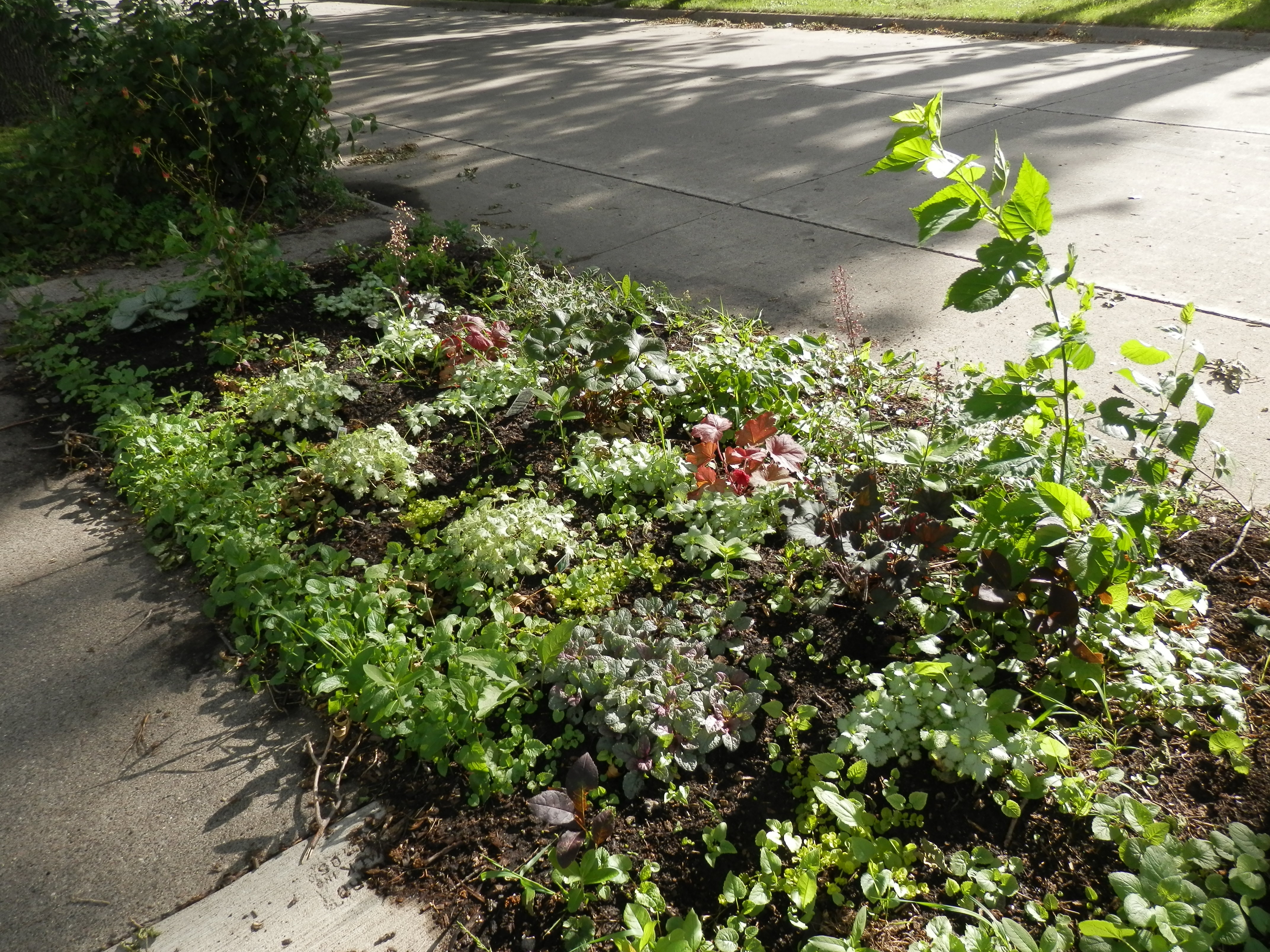 This has long been a problem area – the front boulevard that is heavily shaded for most of the day. We’re starting over with a variety of silvers, reds and yellow-greens. It’s been 3 weeks and everything is still going strong.