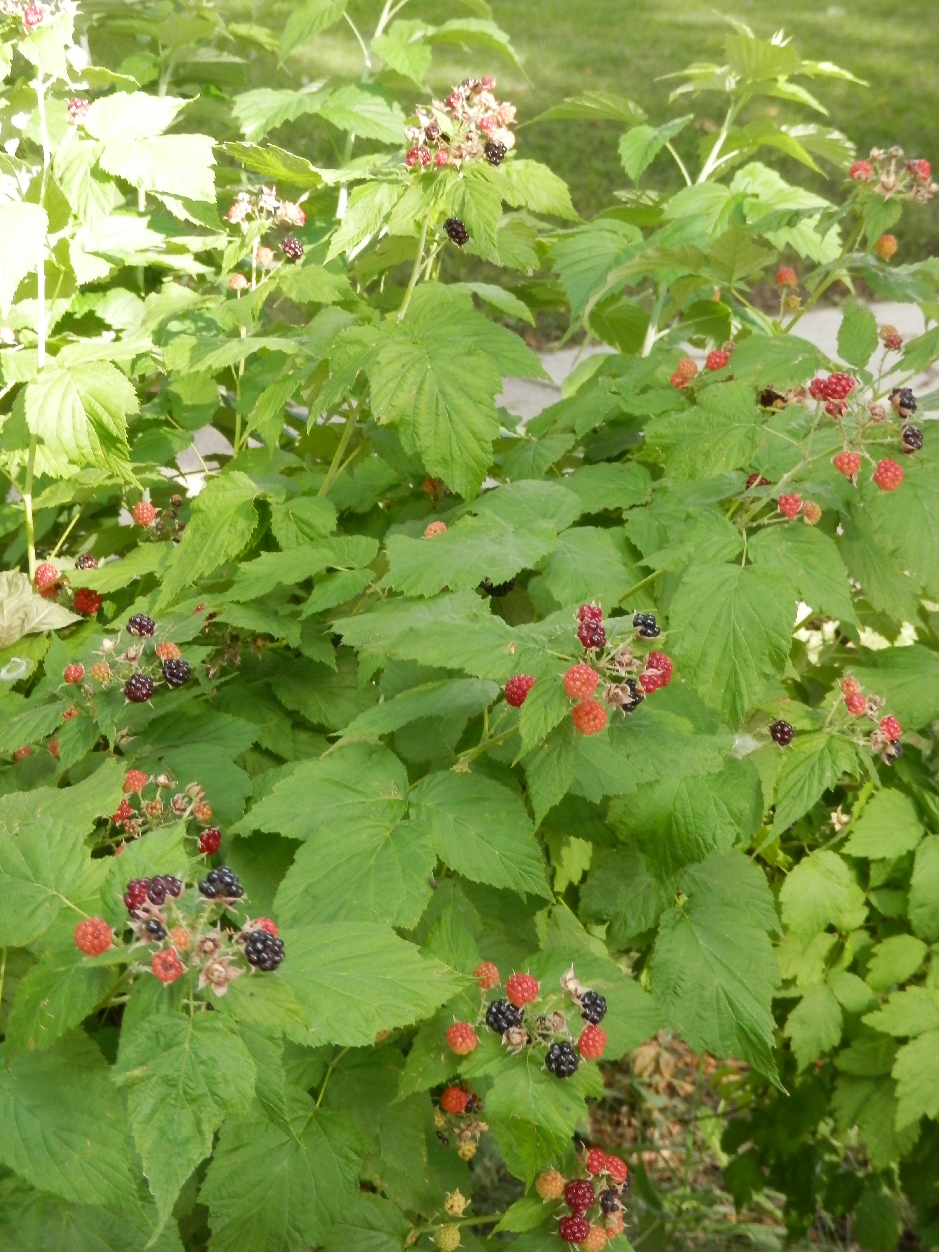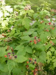 This is a black raspberry bush that planted itself. I love the multicolored berries. We had to move our regular raspberry bushes last year to paint the garage. Two of them died, but the others are hanging in there and producing lots of fruit despite their small size. We’ve got a few blueberries on the brand new blueberry bushes and for the first time, we’re seeing a few berries on the currant bushes.