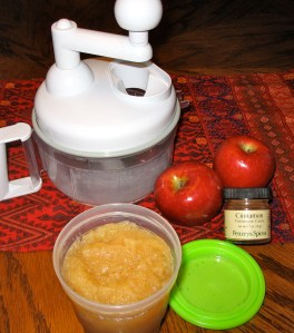 Leslie and I were grocery shopping. She wanted little packets of apple-cinnamon instant oatmeal. It’s fast and (relatively) cheap. But I think it’s slimy and involves wasteful packaging. So I bought oats in bulk, and apples for applesauce to stir in. Simmering the apples made the whole house smell wonderful. I used the hand-crank food processor we got at the fair instead of the electric processor. It was easy and gave me perfect control over the texture. The sauce is delicious, and the reusable container won’t have to be thrown out or recycled.